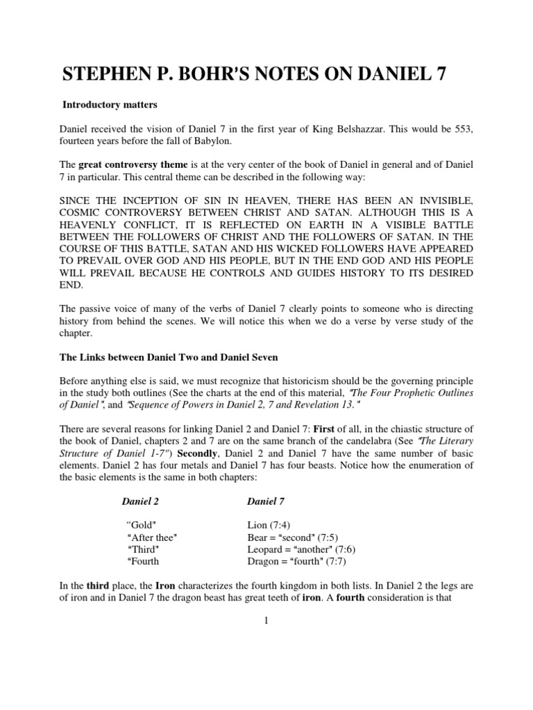The great controversy theme is at the very center of the book of daniel in general and of daniel 7 in particular. Bohrs notes on daniel 7 introductory matters daniel received the vision of daniel 7 in the first year of king belshazzar. C as chapter 9 begins jerusalem was in ruins and the prophet was diligently studying the seventy year prophecy of j eremiah 259 13. Revelation we will see that the second beast of.