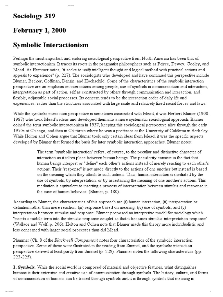 Symbolic interactionism perspective and method pdf. It is written by the leading figure in the school of symbolic interactionism and presents what might be regarded as the most authoritative statement of its point of view outlining its fundamental premises and sketching their implications. Herbert george blumer march 7 1900 april 13 1987 was an american sociologist whose main scholarly interests were symbolic interactionism and methods of social research. Believing that individuals create social reality through collective and individual action he was an avid interpreter and proponent of george herbert meads social psychology which he labelled symbolic interactionism. It is written by the leading figure in the school of symbolic interactionism and presents what might be regarded as the most authoritative statement of its point of view outlining its fundamental premises and sketching their implications.