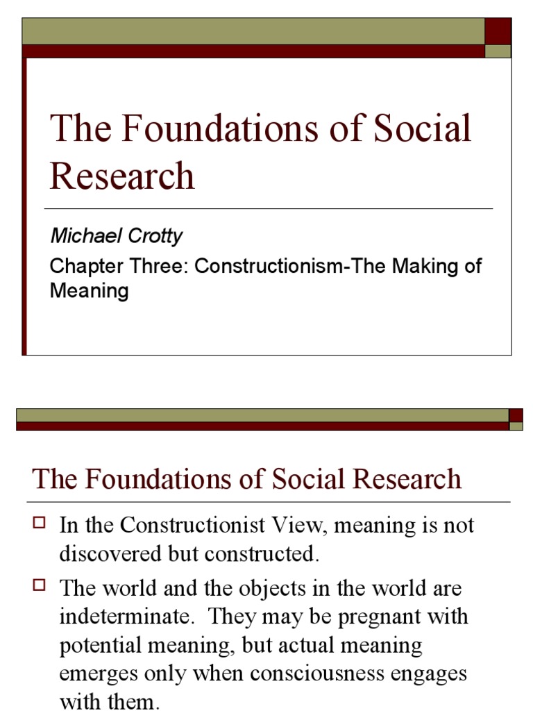 Social research michael crotty chapter nine postmodernism the foundations of social research postmodernism the most slippery of academic terms post as in after logical succession or time succession. Nor is it being suggested that it is the only defensible way to use them. The foundations of social research michael crotty chapter 6. Crottys the foundations of social research is almost two decades old but still one of the best introductions to the philosophy and methodology of the social sciences.