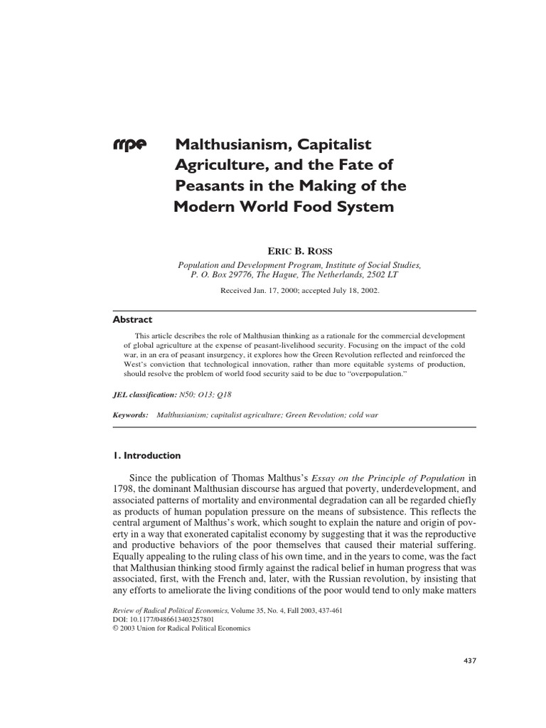 Eric b ross this book represents a major critique of the way malthusian thinking has influenced capitalist development policy in the modern period as well as in the past. Poverty politics and population the malthus factor poverty politics and population in capitalist development t homas malthus a 19th century cleric of the church of eng land is today remembered chiefly as the originator of a theory about human population. Goods must be produced but they must not be distributed. U of toronto p 1997.