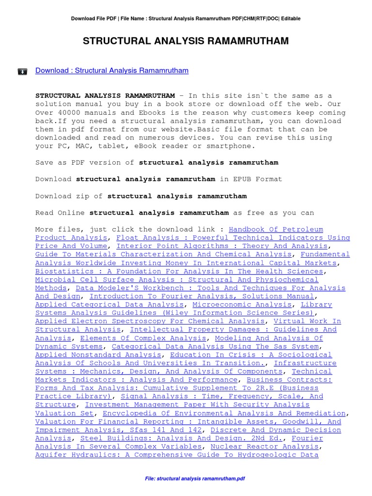 Mignots statement in 1400 at the expertise held in milan that ars sine scientia nihil est practice is nothing without theory testifies to the existence of a medieval rule book for the construction of cathedrals. The few pages of a builders manual bound in with the book of ezekiel in about 600 bc show that there were yet earlier rules. Analysis pdf theory of structures english 9th edition paperback by ramamrutham s. Allows you online search for pdf books ebooks for free downloads in one placecurrent search theory of structures by s ramamrutham.